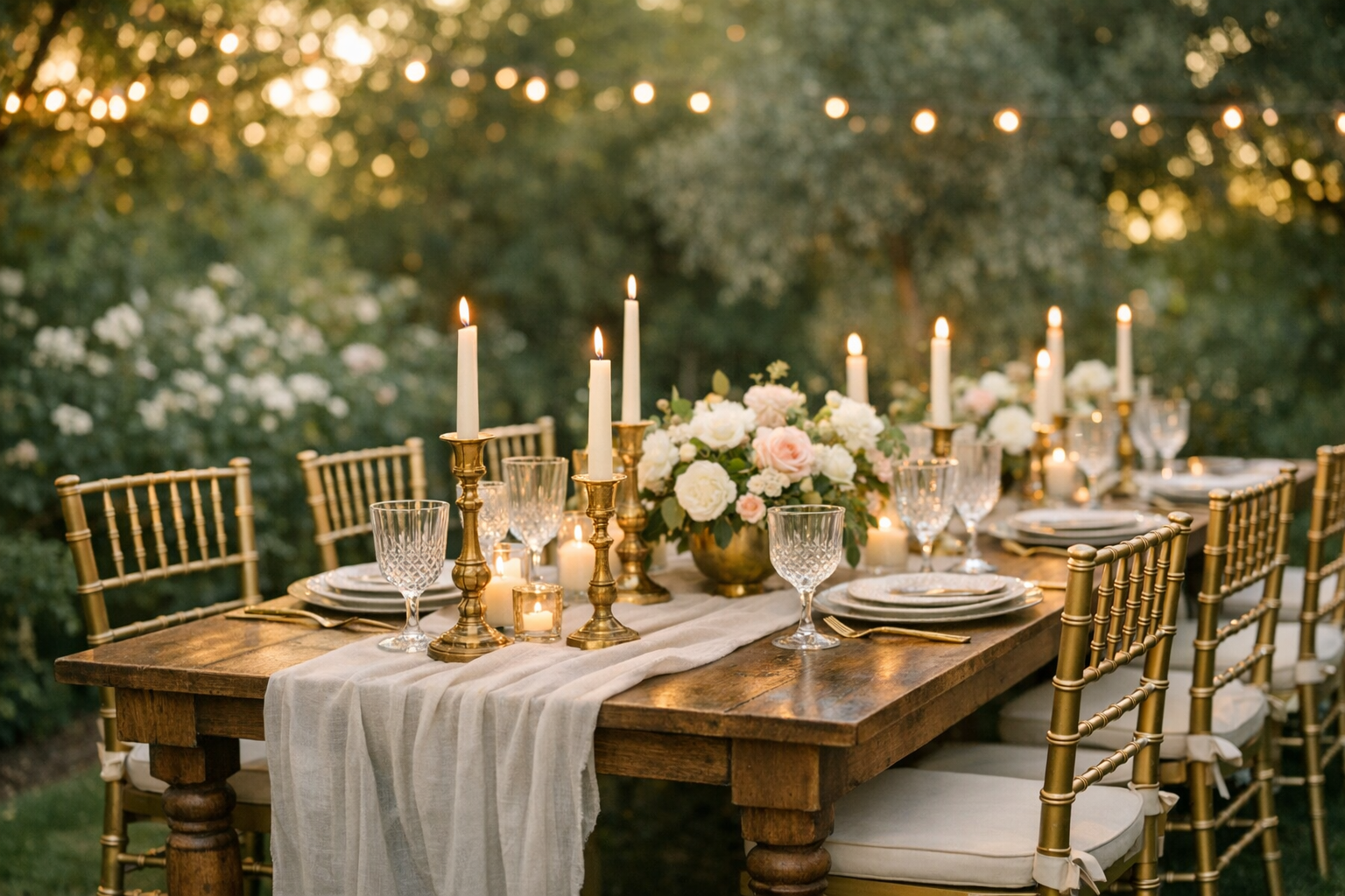 - Lighting rentals: Edison string lights, uplighting, chandeliers, and candelabras
