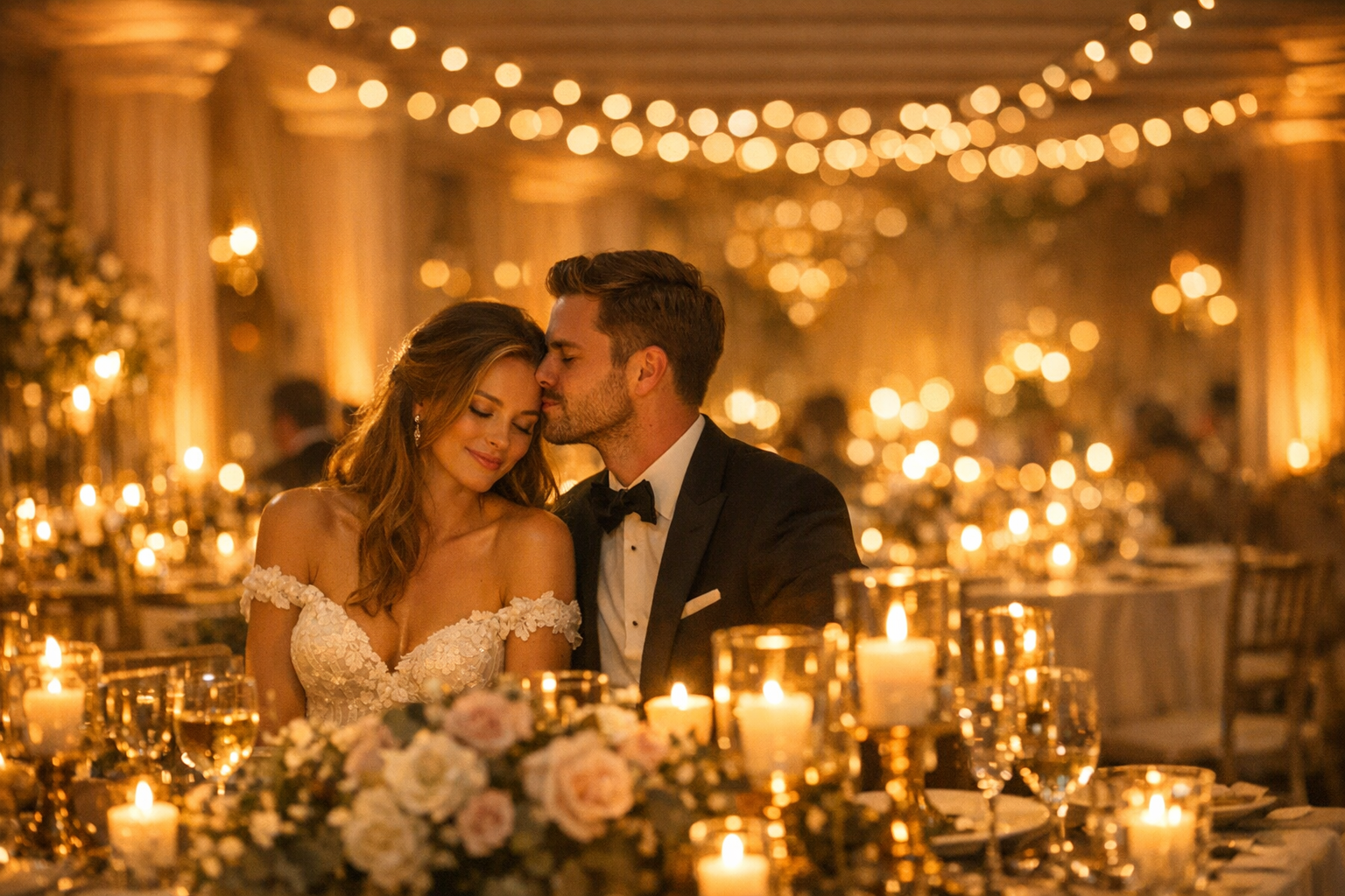 - String lights and chandeliers: Bistro or Edison strands draped across outdoor spaces, tent ceilings, or ballroom rafters