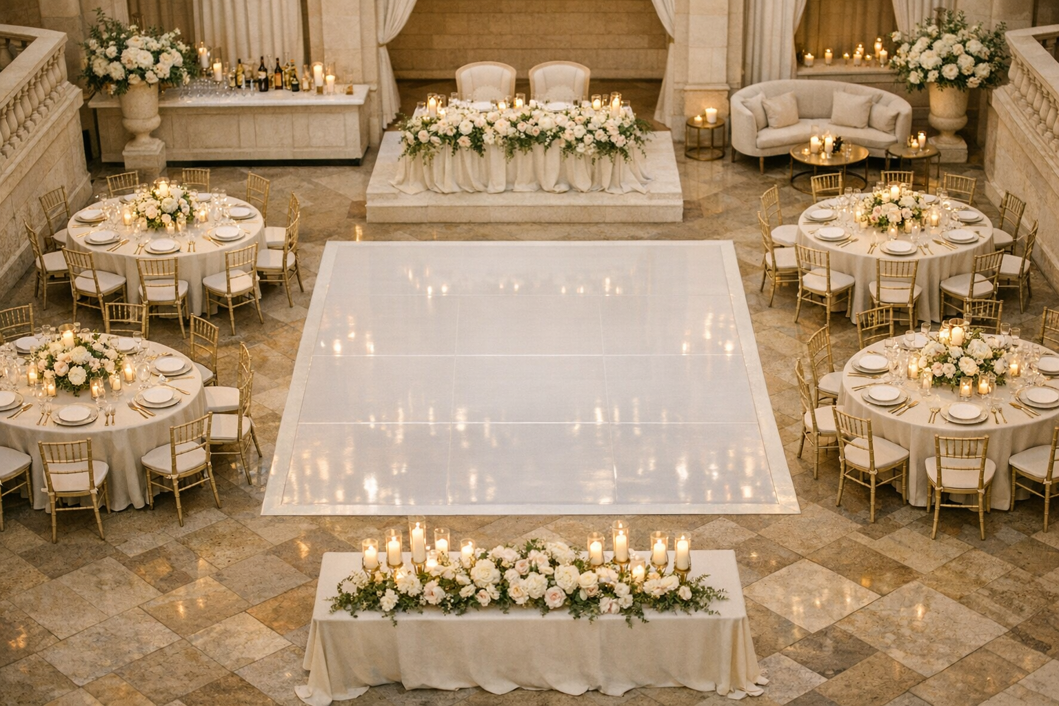 Best for: Formal receptions, larger guest counts, venues with rectangular or square footprints like hotel ballrooms.